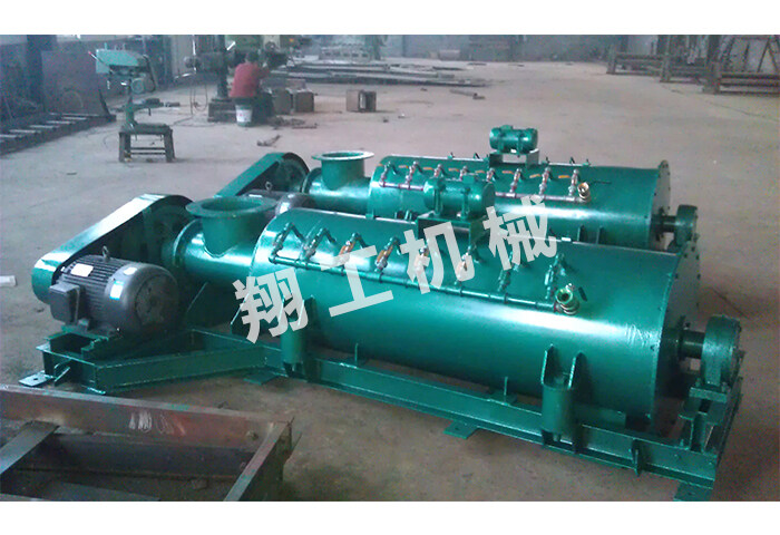 雙軸攪拌機利用兩根呈對稱(chēng)狀的螺旋軸的同步旋轉,在輸送干灰等粉狀物料的同時(shí)加水攪拌,均勻加濕
