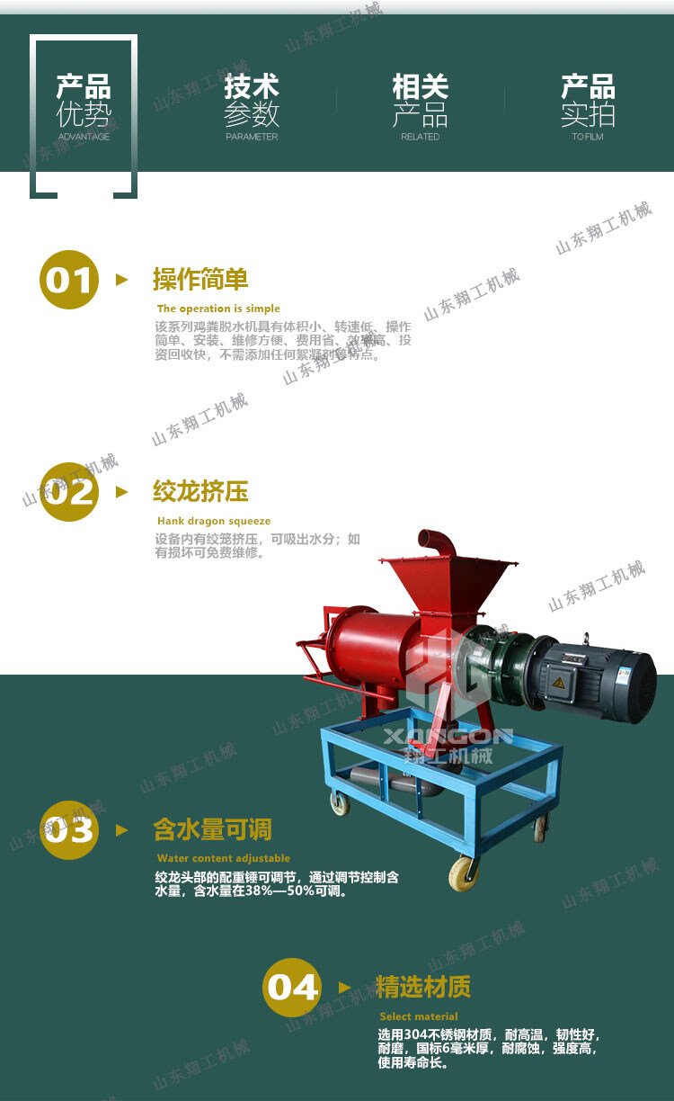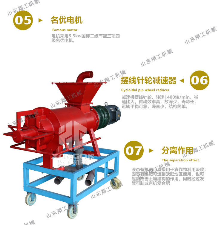 該系列雞糞脫水機具有體積小、轉速低、操作簡(jiǎn)單、安裝、維修方便、費用省、效率高、投資回收快,不需添加任何絮凝劑等特點(diǎn);該機采用的螺旋軸、篩網(wǎng)為不銹鋼制作;禽畜類(lèi)糞便處理機能將雞糞、牛糞、豬糞等禽畜糞便原糞水分離為液態(tài)有機肥和固態(tài)有機肥;液態(tài)有機肥可直接用于農作物利用吸收;固態(tài)有機肥可運到缺肥地區使用,也可起到改觀(guān)土壤結構的作用,同時(shí)經(jīng)過(guò)處理可制成有機復合肥。
