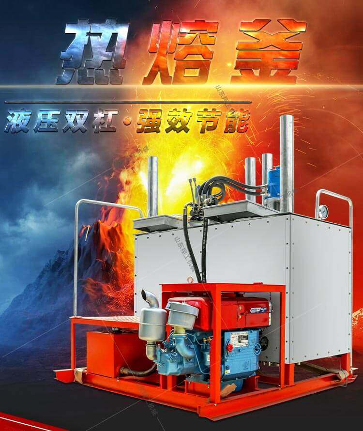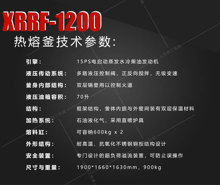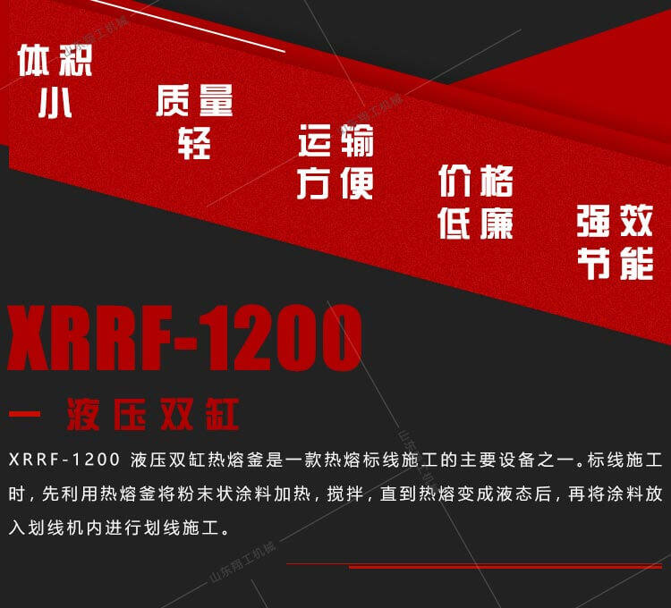 XG1200液壓雙缸熱熔釜是一款熱熔標線(xiàn)施工的主要設備之一。標線(xiàn)施工時(shí),先利用熱熔釜將粉末狀涂料加熱,攪拌,直到熱熔變成液態(tài)后,再將涂料放入劃線(xiàn)機內進(jìn)行劃線(xiàn)施工。由于涂料的融化質(zhì)量直接關(guān)系到標線(xiàn)質(zhì)量,因此熱熔釜是熱熔標線(xiàn)設備的關(guān)鍵部件,是涂料的融化必不可少的部分。