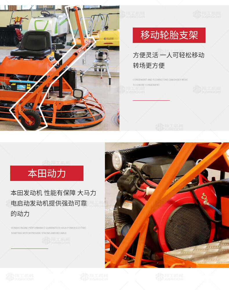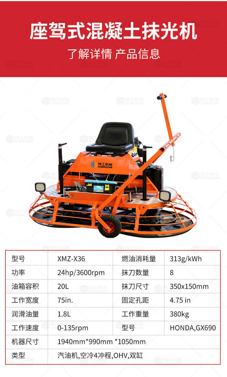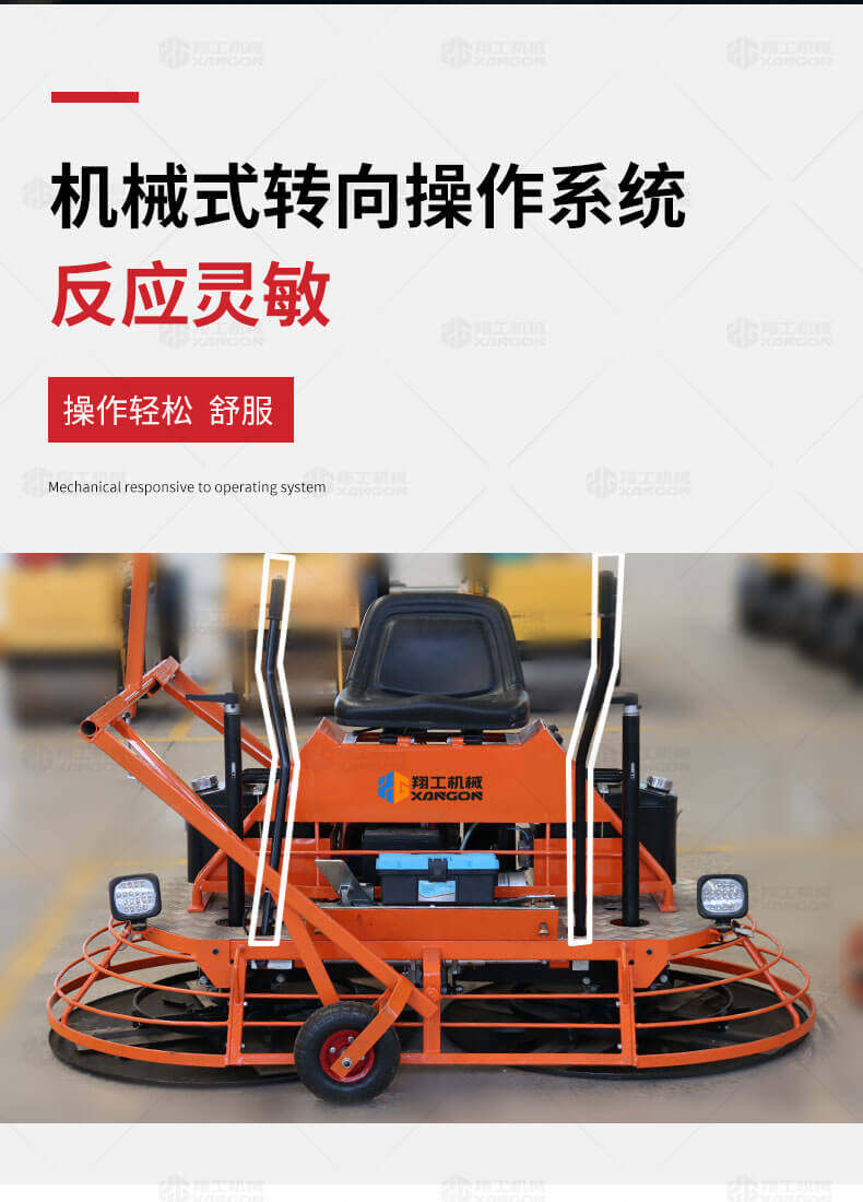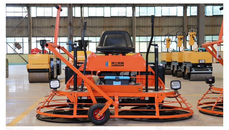 座駕式混凝土抹光機用于混凝土地面的提漿、壓實(shí)、抹平、抹光,相對于手扶式抹光機,效率高。