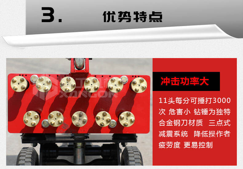 1、11個(gè)鑿毛頭的沖擊功率大,可達2200blow/分鐘,危害??;