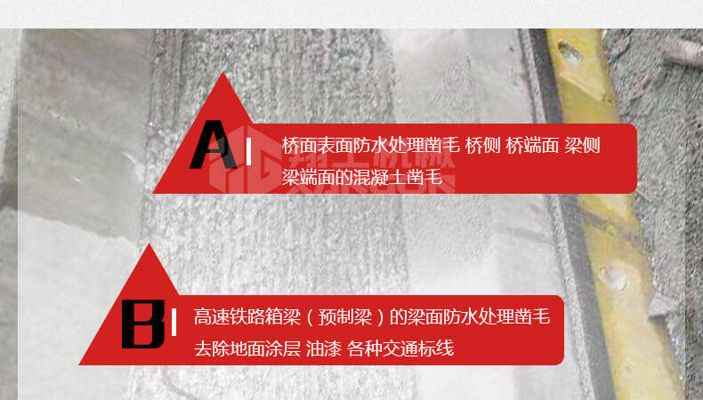 8、震動(dòng)傷害小。 鑿毛機可在對主體無(wú)任何破壞的情況下,在1-100mm鑿剔深度之間自由掌控,鑿除混凝土表面光滑面積可達100%,鑿毛能力可根據混凝土的不同強度和深度,每小時(shí)可達到4m2--100m2的工作量。與傳統鑿毛工藝相比,可明顯加速工程進(jìn)度,降低勞動(dòng)消耗,減少環(huán)境污染,節省工程造價(jià),實(shí)現理想的工程質(zhì)量,具有廣闊的市場(chǎng)前景。