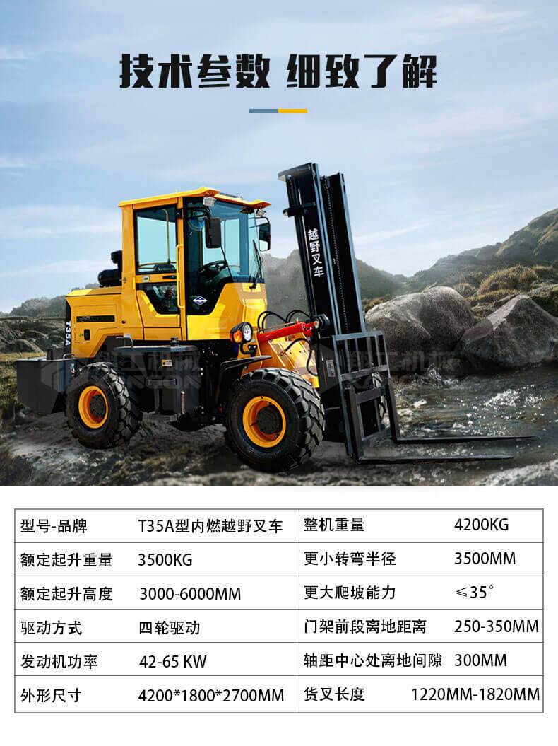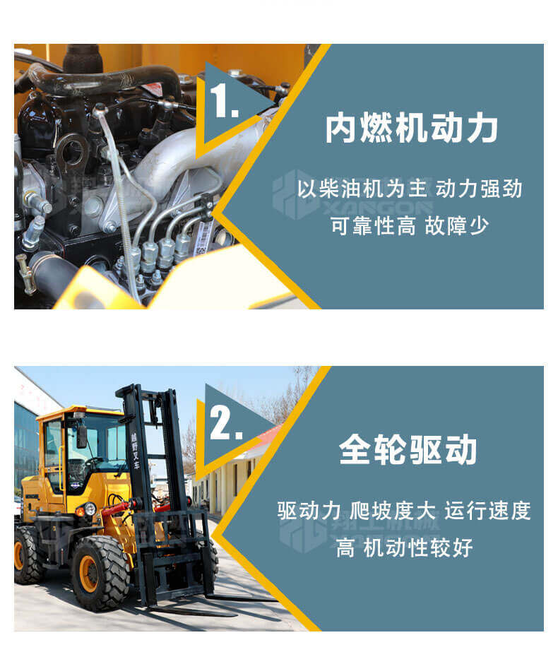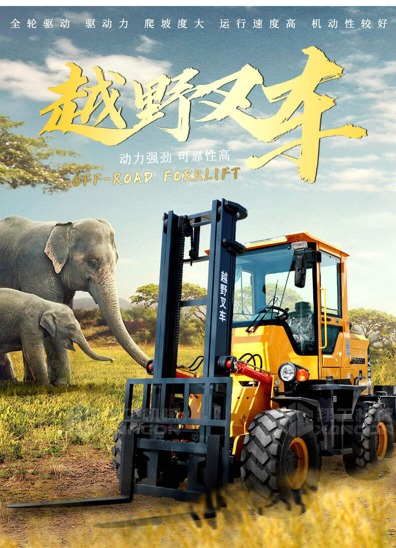 5.越野叉車(chē)發(fā)動(dòng)機功率大,采用全輪驅動(dòng)和越野輪胎。
