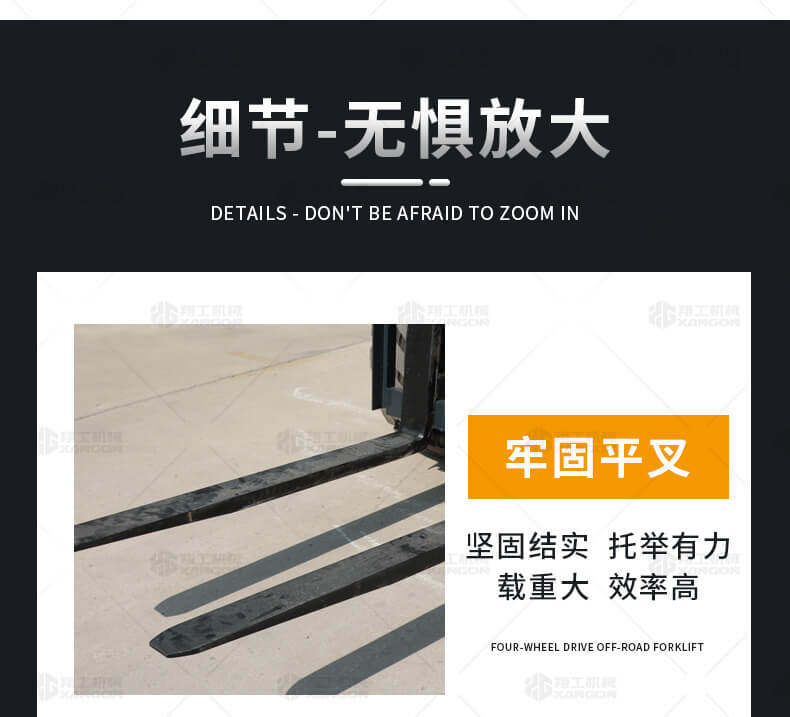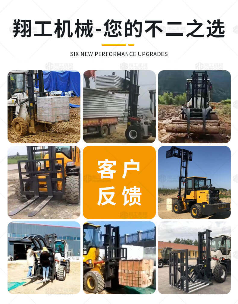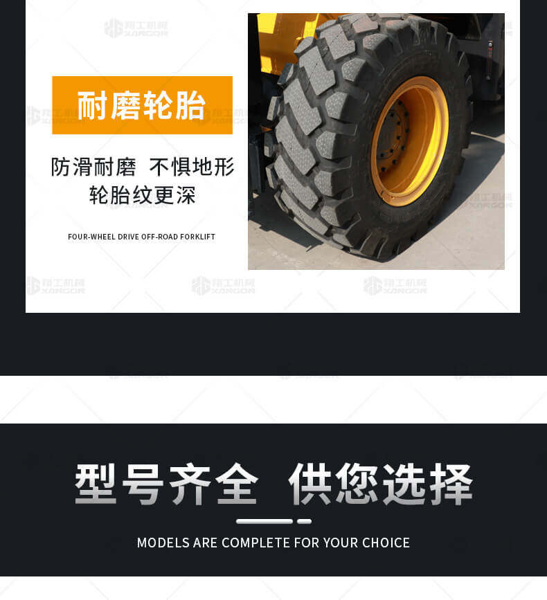 5.越野叉車(chē)發(fā)動(dòng)機功率大,采用全輪驅動(dòng)和越野輪胎。