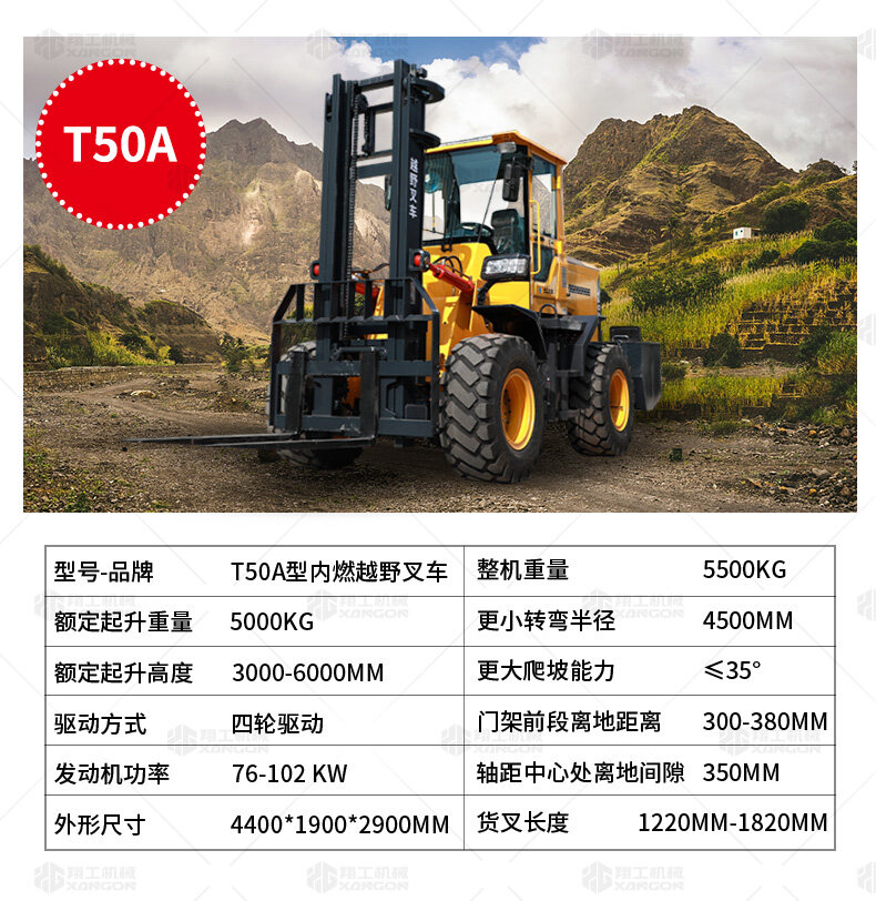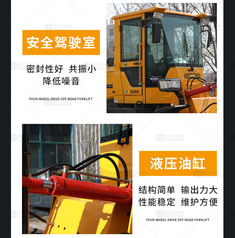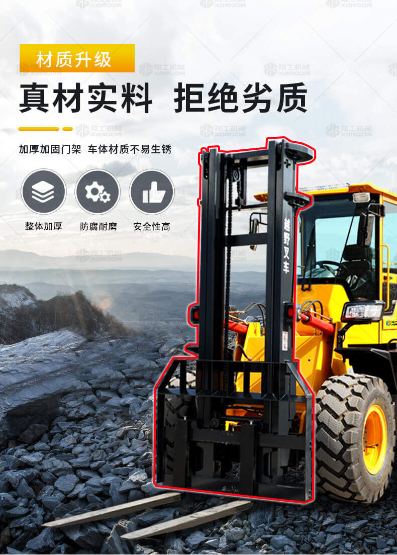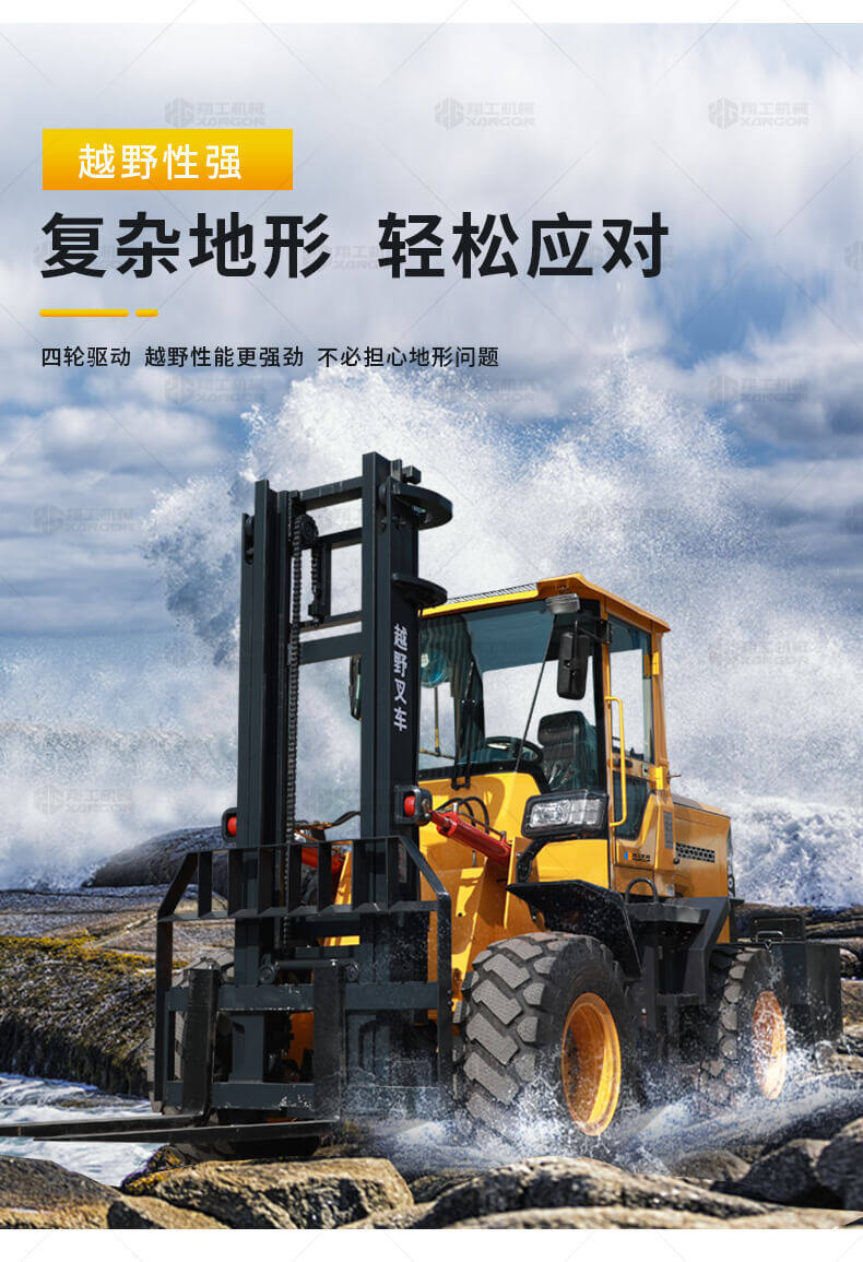 3.普通叉車(chē)只能在平整的路面上作業(yè),而越野叉車(chē)既可以在普通路面上作業(yè),還可以在山路泥路崎嶇道路作業(yè),輪胎抓地力強,不打滑。