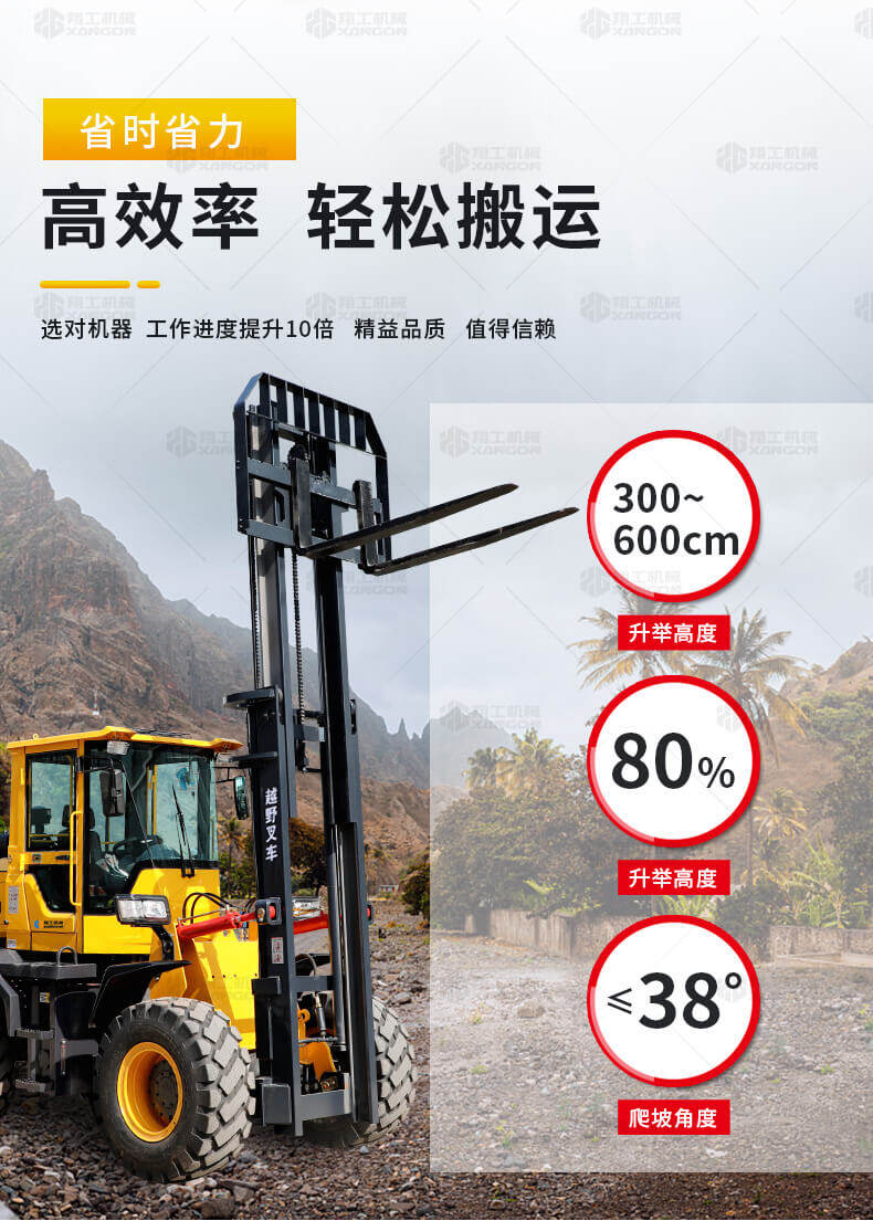 4.越野叉車(chē)的速度高于普通叉車(chē),目前已發(fā)展到40km/h,其機動(dòng)性顯而易見(jiàn)。