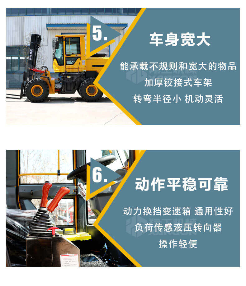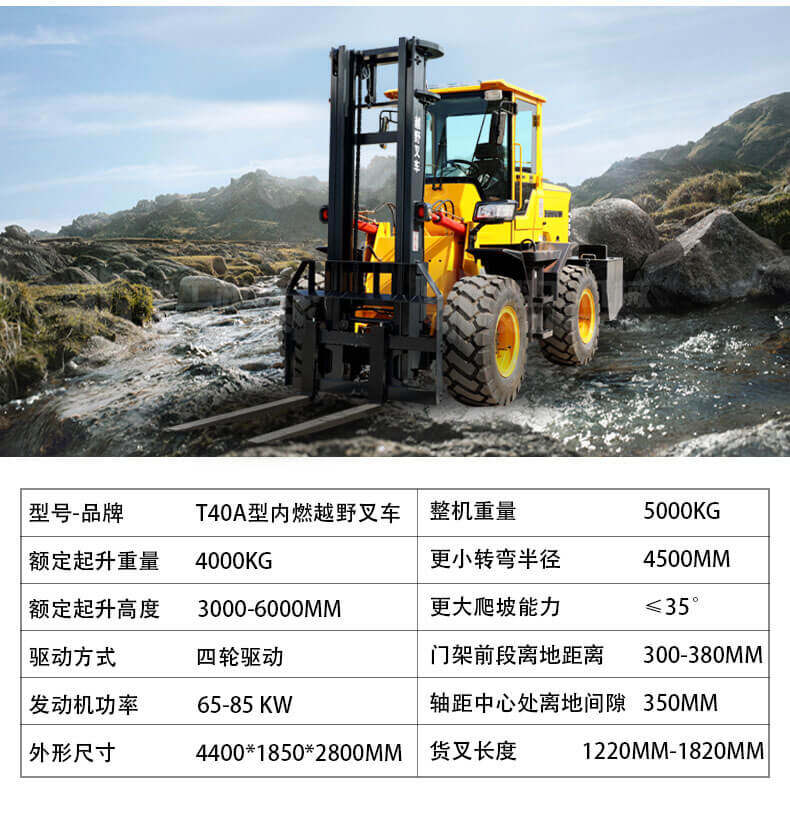 3.普通叉車(chē)只能在平整的路面上作業(yè),而越野叉車(chē)既可以在普通路面上作業(yè),還可以在山路泥路崎嶇道路作業(yè),輪胎抓地力強,不打滑。