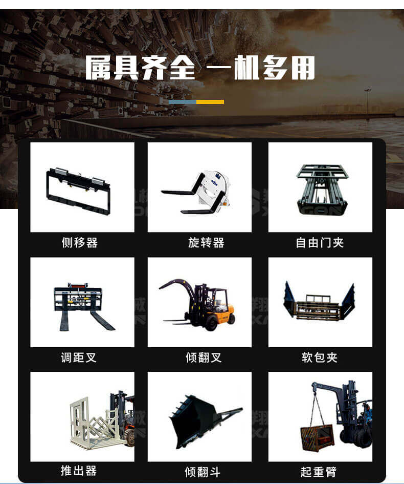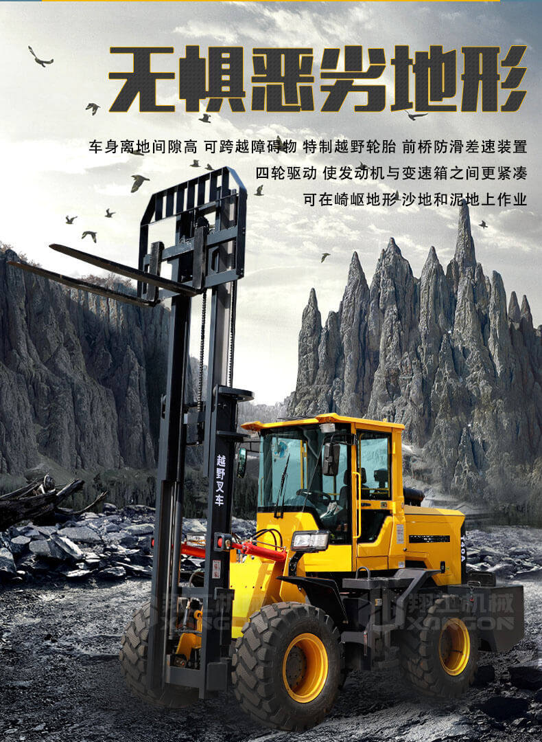 多功能四驅越野叉車(chē)可以在坡地和不平地面上進(jìn)行貨物裝、卸、堆垛及搬運作業(yè),具有良好的機動(dòng)性、越野性可靠性。其功能多樣,可搭配側移器、調距叉、旋轉器、軟包夾、推出器、側翻叉、側翻斗、起重臂等工具完成不同的工作。