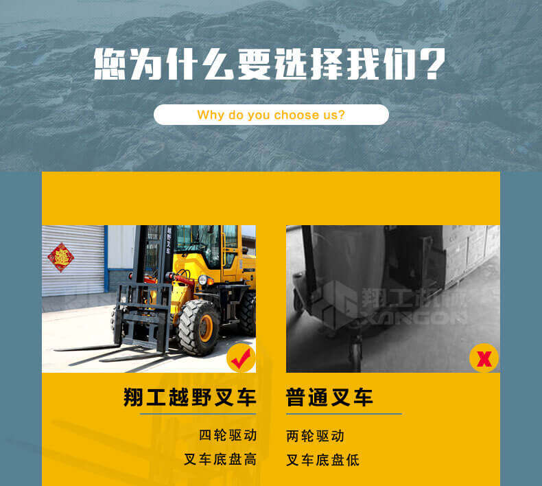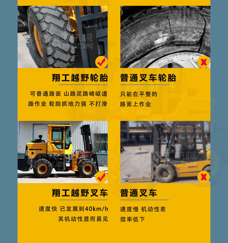 3.普通叉車(chē)只能在平整的路面上作業(yè),而越野叉車(chē)既可以在普通路面上作業(yè),還可以在山路泥路崎嶇道路作業(yè),輪胎抓地力強,不打滑。