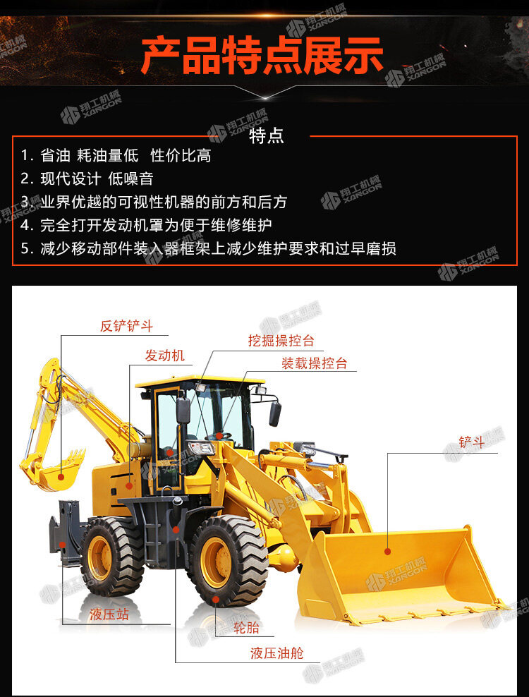 挖掘裝載機主要用于城市和農村的公路建設及養護、電纜鋪設、電力和機場(chǎng)工程、市政建設、農田水利建設、農村住宅建設、開(kāi)山取石以及各種小型建筑隊所從事的各種建筑施工工程。