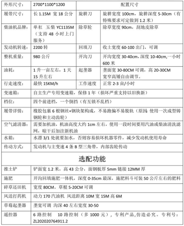 選配:推土鏟、施肥器、打藥機、碎草機等