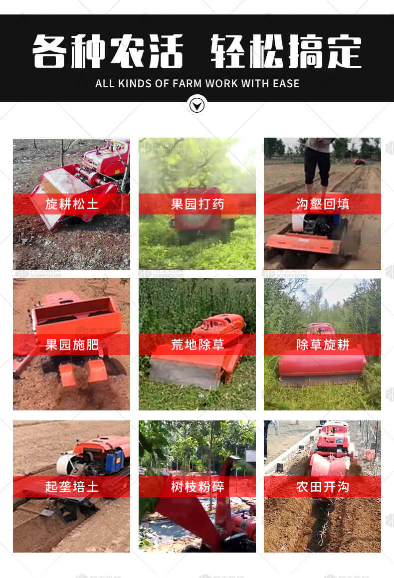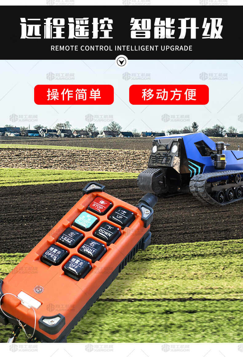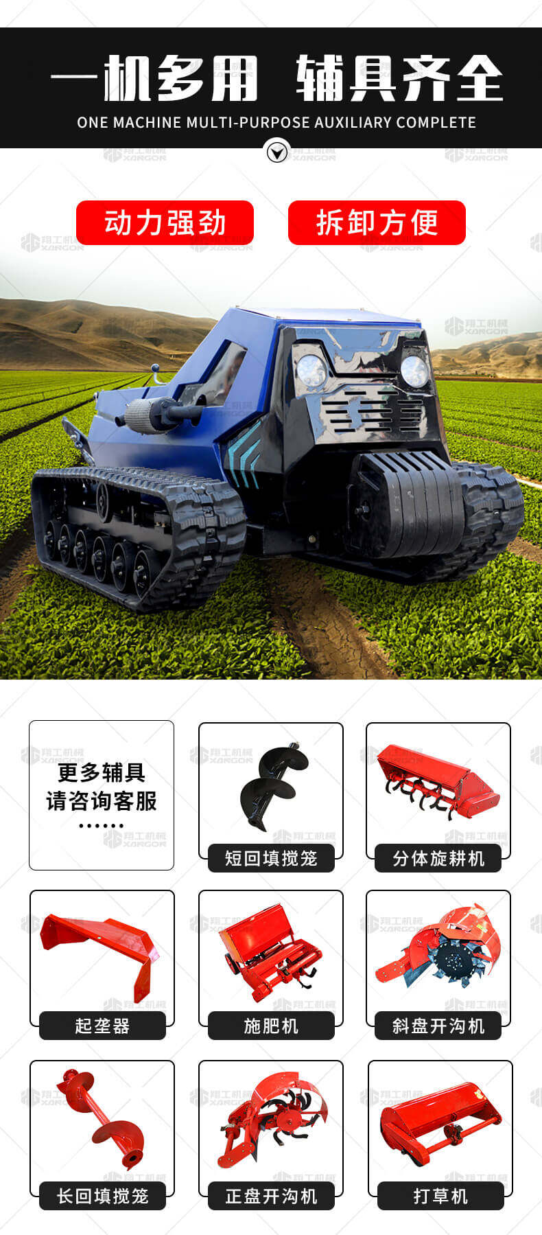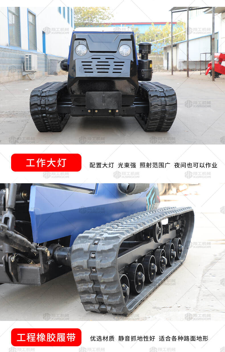 本產(chǎn)品采用履帶式驅動(dòng)設計,穩定性和爬坡能力較強,適應丘陵山地平原各種地形,機型小功率大,適應各種行距的果樹(shù),大棚,園林。產(chǎn)品動(dòng)力強勁,結實(shí)耐用,性能優(yōu)越,安全放心,遠程操控,省心省力。