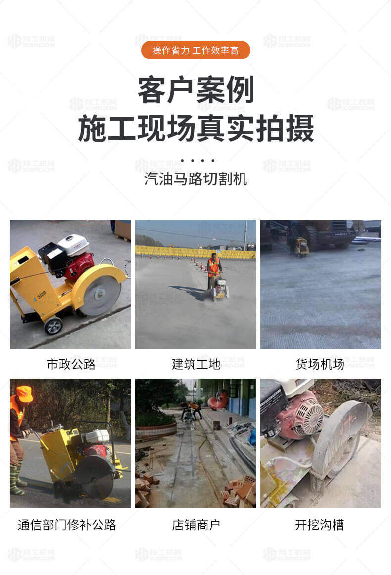 用于公路、市政、建筑、煤氣、通信部門(mén)修補公路或開(kāi)挖溝槽時(shí)進(jìn)行路面切割。相對于電動(dòng)或柴油動(dòng)力的路面切割機,操作輕巧省力,運輸方便,工作效率高。
